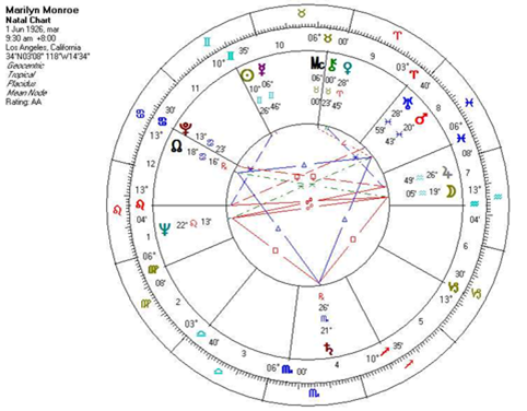- Marilyn nació el 1 de junio de 1926 a las 09:30 am en Los Ángeles, California. El Sol está en la Casa 10 lo que sugiere éxitos, reconocimiento y fama en su desempeño mundano. La Luna está en conjunción a Júpiter en la Casa 7; y la clásica explicación de Júpiter en la Casa 7 es que ella se casó varias veces con gente conocida, famosa. Y sí, Júpiter puede funcionar así, pero en realidad… es una estructura compleja porque la Luna está en oposición a Neptuno y en cuadratura a Saturno. En principio, con la Luna en Casa 7 la persona tiene un tema con la madre que se interpone en la relación con todos; es sabido que su madre puso a Marilyn en un orfanato desde muy temprana edad y pasó parte de su infancia y adolescencia entre orfanatos y hogares sustitutos; trato de ser la mejor hija, la niña perfecta, la que todos querían pero en realidad ella buscaba seguridad, protección y cuidado. Tener en cuenta que no estamos hablamos de la madre real sino que el principio materno está en la Casa 7.